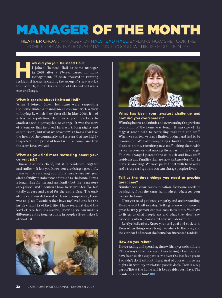 Heather Choat, Home Manager at Halstead Hall Care Home has been recognised as ‘Manager of the Month’ in the September edition of the Care Home Professional.